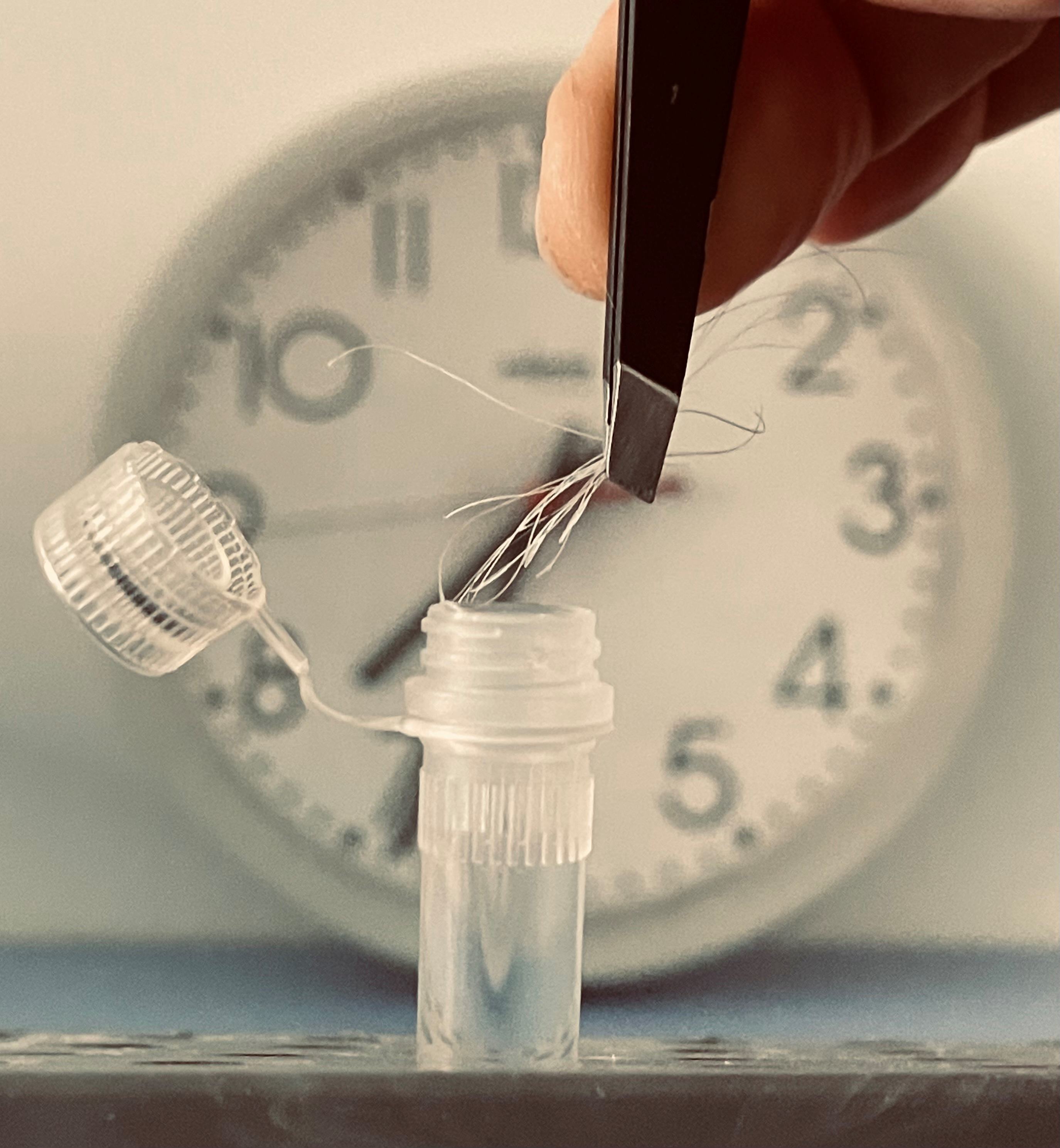 Circadian clocks govern daily physiological and behavioral processes and are crucial for health; disruptions can lead to various diseases. The circadian phase of entrainment—the phase of the internal circadian clock in relation to external environmental cycles—is influenced by both genetic and environmental factors, varies between individuals, and is reflected in daily behaviors such as sleep–wake patterns, cognitive performance, and physical activity. While circadian phase may also fluctuate within individuals, the dynamics and extent of such variation in daily life remain largely unexplored. The gold standard for circadian phase assessment, dim-light melatonin onset (DLMO), is impractical for large-scale studies, and blood-based molecular biomarkers, while promising, are limited in feasibility. To address these challenges, we developed HairTime, a noninvasive assay that estimates circadian phase from a single daytime hair sample. Developed and evaluated in two steps—a training and a validation study—HairTime demonstrated strong predictive power compared to DLMO. Suitable for large-scale studies, it was assessed using over 4,000 samples. Circadian phase estimations showed a normal distribution and were associated with age, sex, and notably, work schedules, with earlier timing on workdays, suggesting that societal factors can modulate internal rhythms. Together, these findings establish HairTime as a promising tool for assessing circadian phase in research and lay the foundation for future applications in personalized chronotherapy.